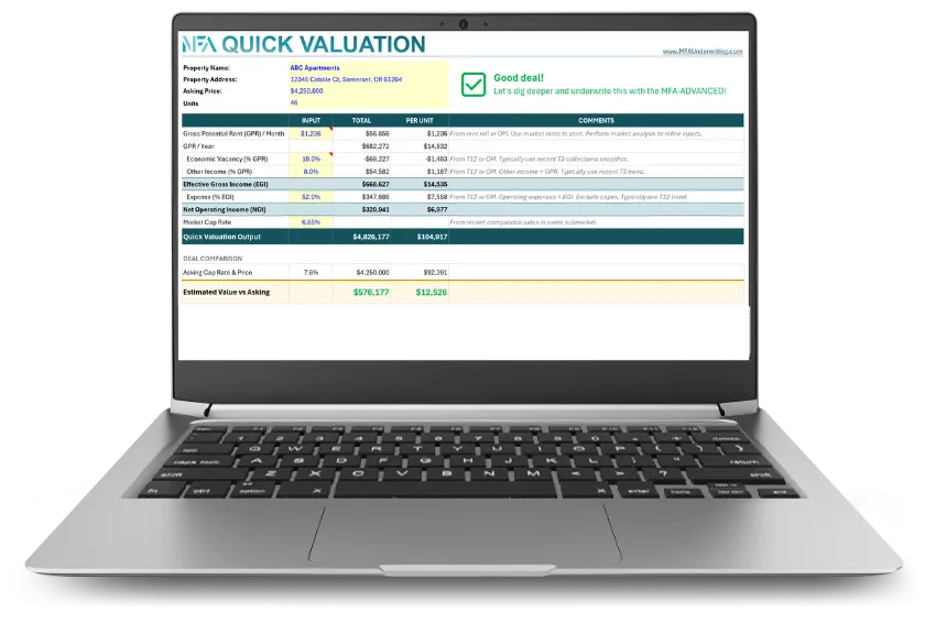 MFA is built by an active GP and designed around real multifamily acquisition workflows. It focuses on clean structure, accurate analysis, and investor-ready outputs rather than generic templates.